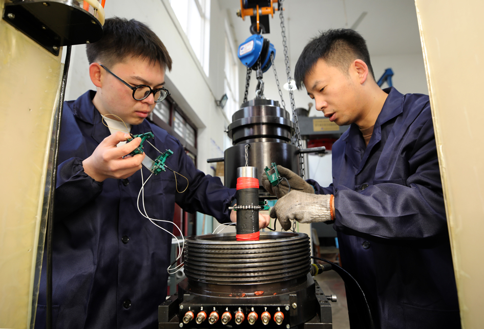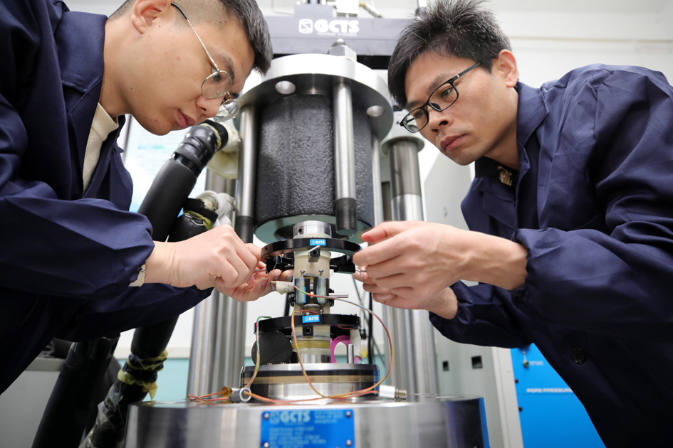 ▲3月8日上午,BEAT365英国官网网站建筑与土木工程公司的科研人员在深部岩土动静三轴力学特性实验室做裂隙花岗岩三轴压缩试验。