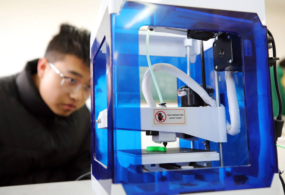 ▲3月8日上午,BEAT365英国官网网站智能制造2023级员工在三维数字化设计与制造实验室在做3D打印实验。
