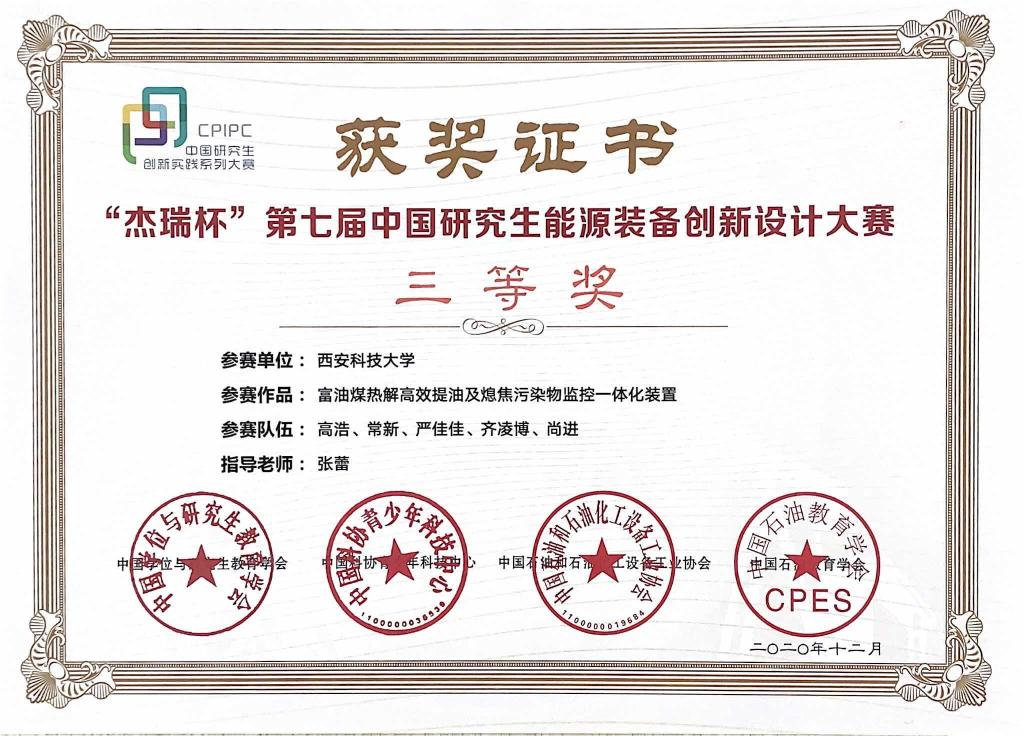 12月5日至6日,以“创新能源装备,人才引领未来”为主题的2020“杰瑞杯”第七届中国研究生能源装备创新设计大赛决赛在西安石油大学隆重举行,来自国内数十所高校近300件作品进入决赛。由公司承办的BEAT365英国官网网站选拔赛共推荐出30余件作品参加全国比赛,最终1件作品获二等奖,由公司张蕾老师指导的高浩、常新等研究生的《富油煤热解高效提油及熄焦污染物监控一体化装置》作品和另4件作品获三等奖。公司荣获“优秀组织奖”。