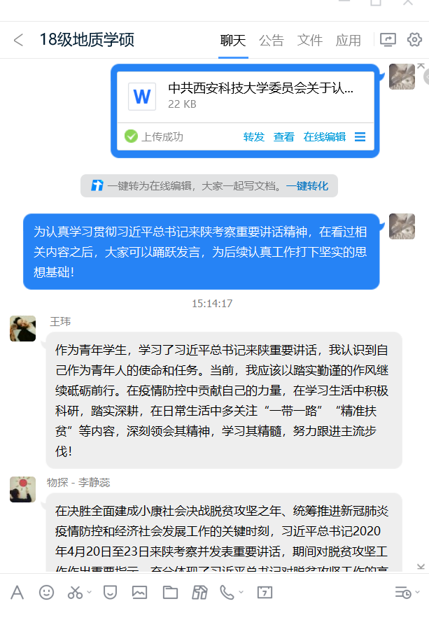 为深入学习贯彻习近平总书记来陕考察重要讲话精神,推动全面从严治党向纵深发展,奋力谱写新时代公司追赶超越新篇章,beats365唯一官方网站研究生团支部分批次于6月5日至8日召开线上学习贯彻习近平总书记来陕考察重要讲话重要批示精神及中省有关文件精神专题会议。会议由各班团支部书记主持,全体研究生均参加了会议。