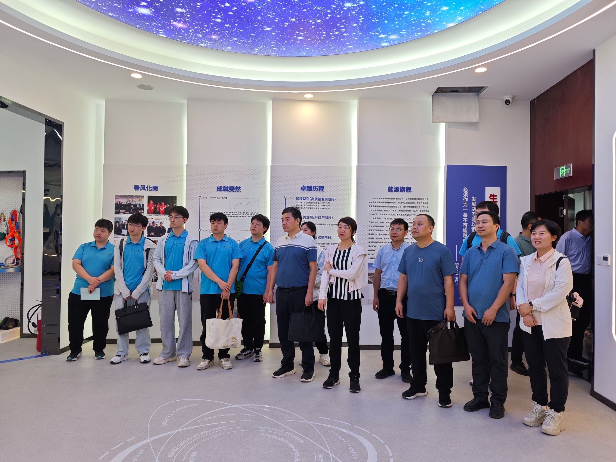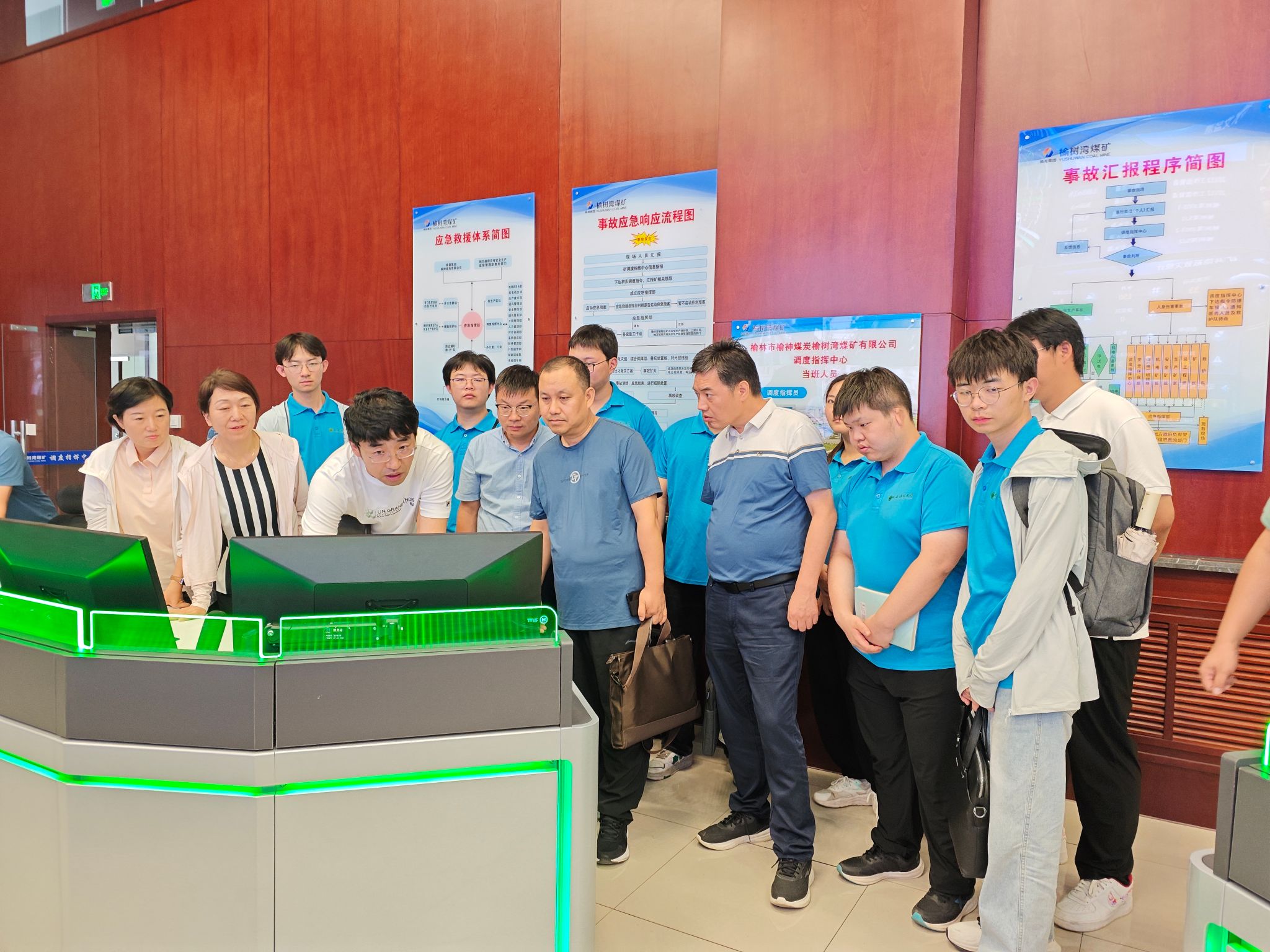 与会师生一行参观了榆树湾煤矿调度指挥中心,调度中心负责人介绍了煤矿生产调度工作,对采掘、通风、排水等关键系统进行了说明,重点讲解了煤矿透明地质保障系统。通过此次参观,师生们对榆树湾煤矿的整体运营情况有了更为深入、全面的认识与了解。