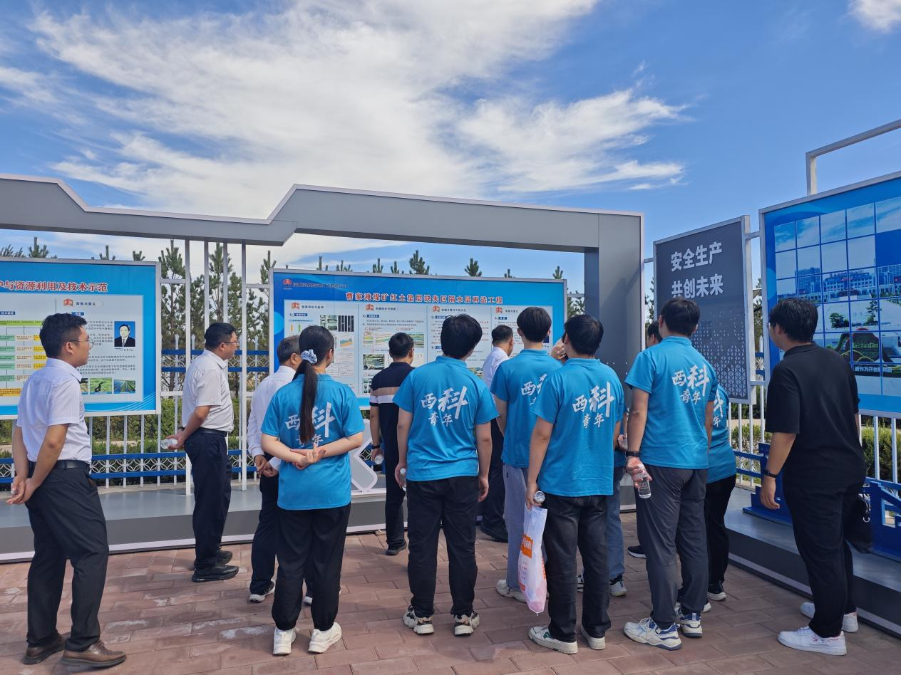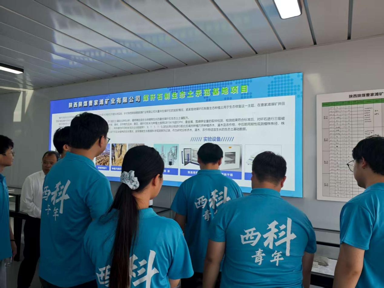 在陕西陕煤曹家滩矿业有限公司煤矸石制生态土基地示范项目,成员们学习了将煤矸石转化为可用于绿化的生态土的前沿研究成果,为解决固体废弃物堆放难题和矿区复垦和植被恢复提供了新方案,实现了资源循环利用。