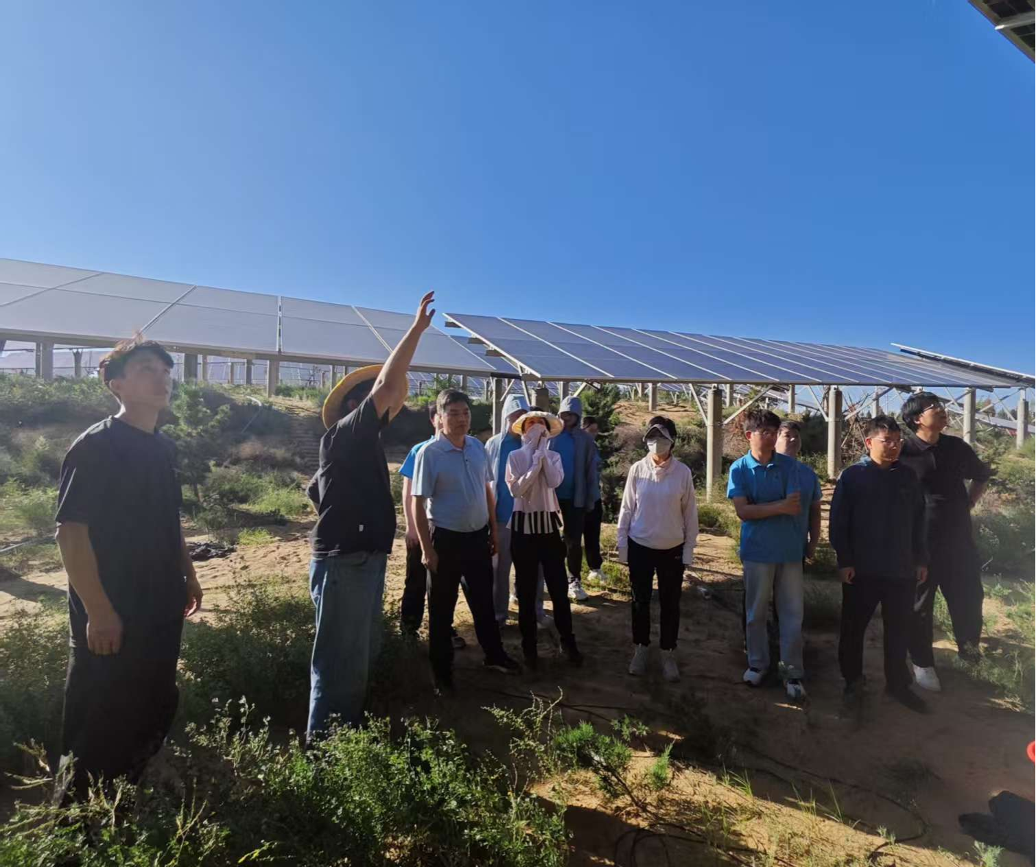 在光伏发电设备现场,项目成员白祖诚向实践团成员介绍光伏固沙的优势、光伏板条件下雨水的分布规律及对植物生长的多方位调控,光伏板的建设有助于减弱风力,减少扬沙浮沉,形成物理固沙。土壤在这里呈现出板上下缘和中部缝隙含水量高,对应植物生长茂盛。