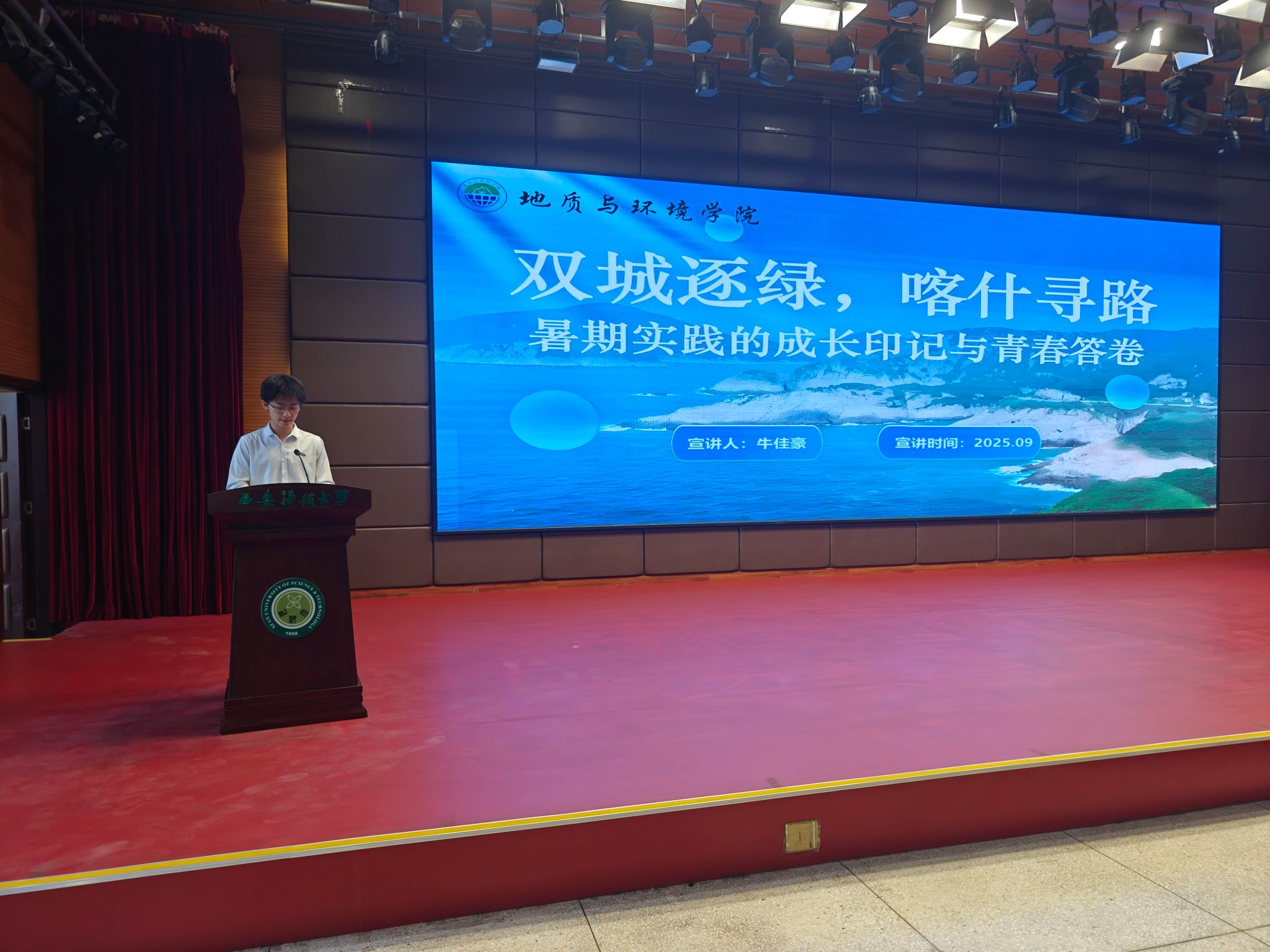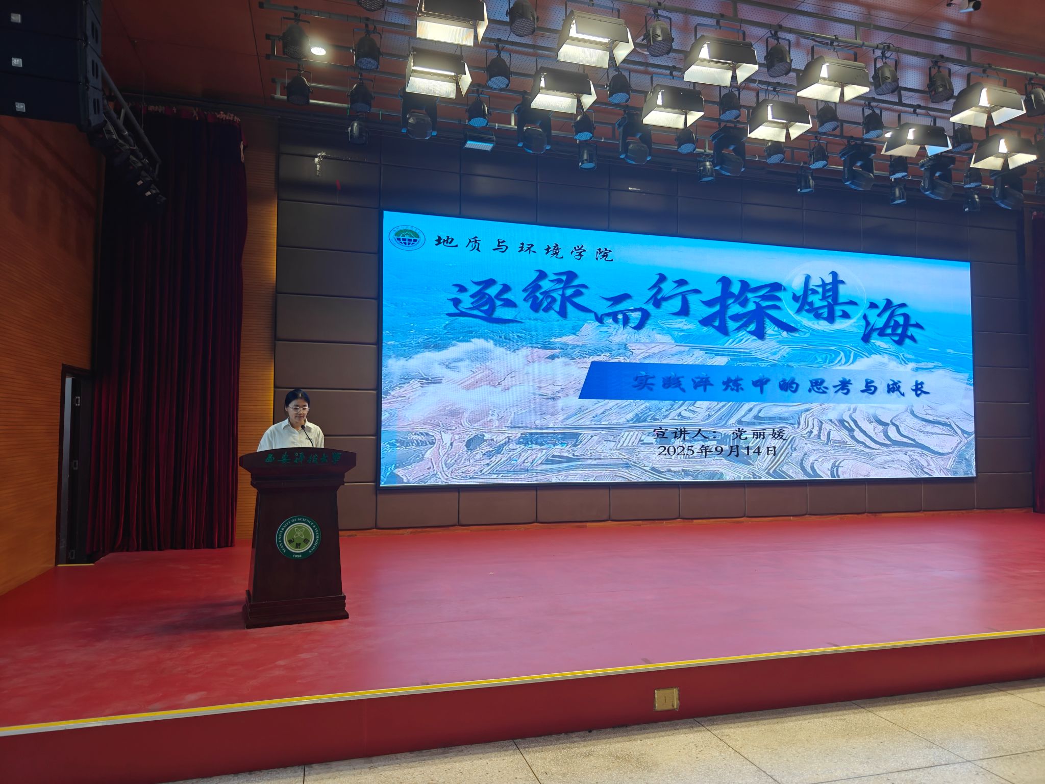 资源勘查工程2302 班党丽媛同学以“逐绿而行探煤海:实践淬炼中的思考与成长”为主题,分享了暑期社会实践赴鄂尔多斯、榆林等煤炭矿区的收获。通过走访黑岱沟、曹家滩等多个现代化煤矿,她见证了智能化开采、生态修复与绿色转型的协同发展,深刻体会到煤炭行业正从传统粗放走向智能绿色新阶段。此次实践不仅深化了她对专业知识的理解,更坚定了将个人成长融入国家能源战略的决心。