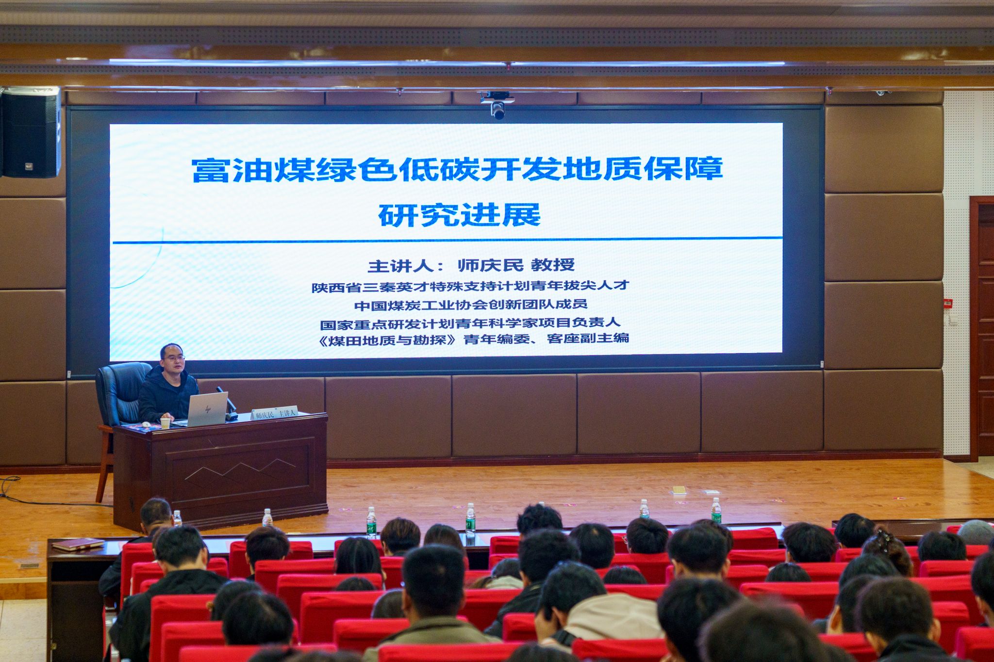 系列活动精彩纷呈,院士领衔开启序章。“科技成果进课堂”活动一经启动,便以其高水平的学术内容引发了师生的广泛关注和热烈反响。活动第一讲特邀中国工程院院士、公司王双明教授作了题为《对煤炭绿色低碳发展的思考》的精彩报告。王院士从国家“双碳”战略目标出发,深刻阐述了中国能源结构的现实基础,系统剖析了煤炭行业保供与绿色转型的双重压力与发展路径,为师生呈现了一场紧扣国家战略与学科前沿的学术盛宴。紧随其后,活动第二讲由陕西省三秦英才特殊支持计划青年拔尖人才师庆民教授主讲。他以《富油煤绿色低碳开发地质保障研究进展》为题,从国家能源战略需求切入,重点讲解了其团队在富油煤地质识别、热解产出规律及地质约束机制等方面的最新科研进展,展现了青年科技工作者的创新活力。
