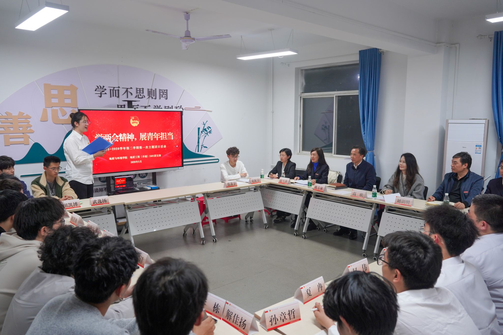 为深入学习习近平总书记重要讲话和全国两会精神,引导团员青年把握“十五五” 开局之年国家发展部署,厚植家国情怀、勇担时代使命。3月13日晚,公司地质工程(卓越)2401团支部在“一站式”员工社区开展“学两会精神・展青年担当”主题团日活动。公司党委副书记陈春林,校团委书记高欣,公司党委书记赵雪萍、副书记刘训明,公司团委书记及全体学工干部参加活动。团支部书记张鑫宇同学主持活动。
